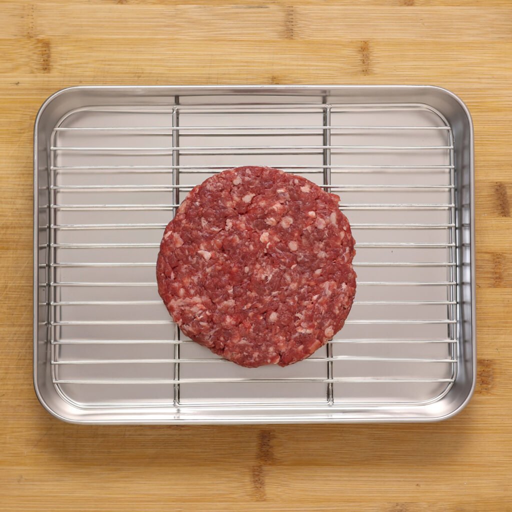 The beef patty is made by aged meat resulting concentrated flavors and enhanced tenderness. this premium patty is prized for its rich taste and unique texture.